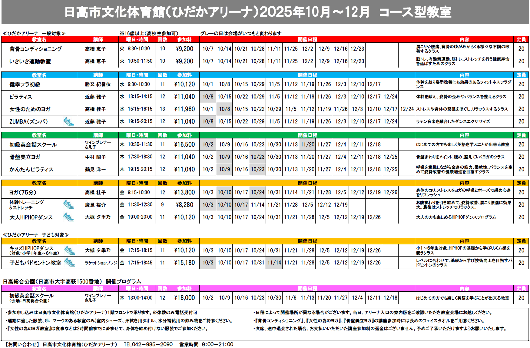 ひだかアリーナ2025年度 第3期コース型教室のご案内