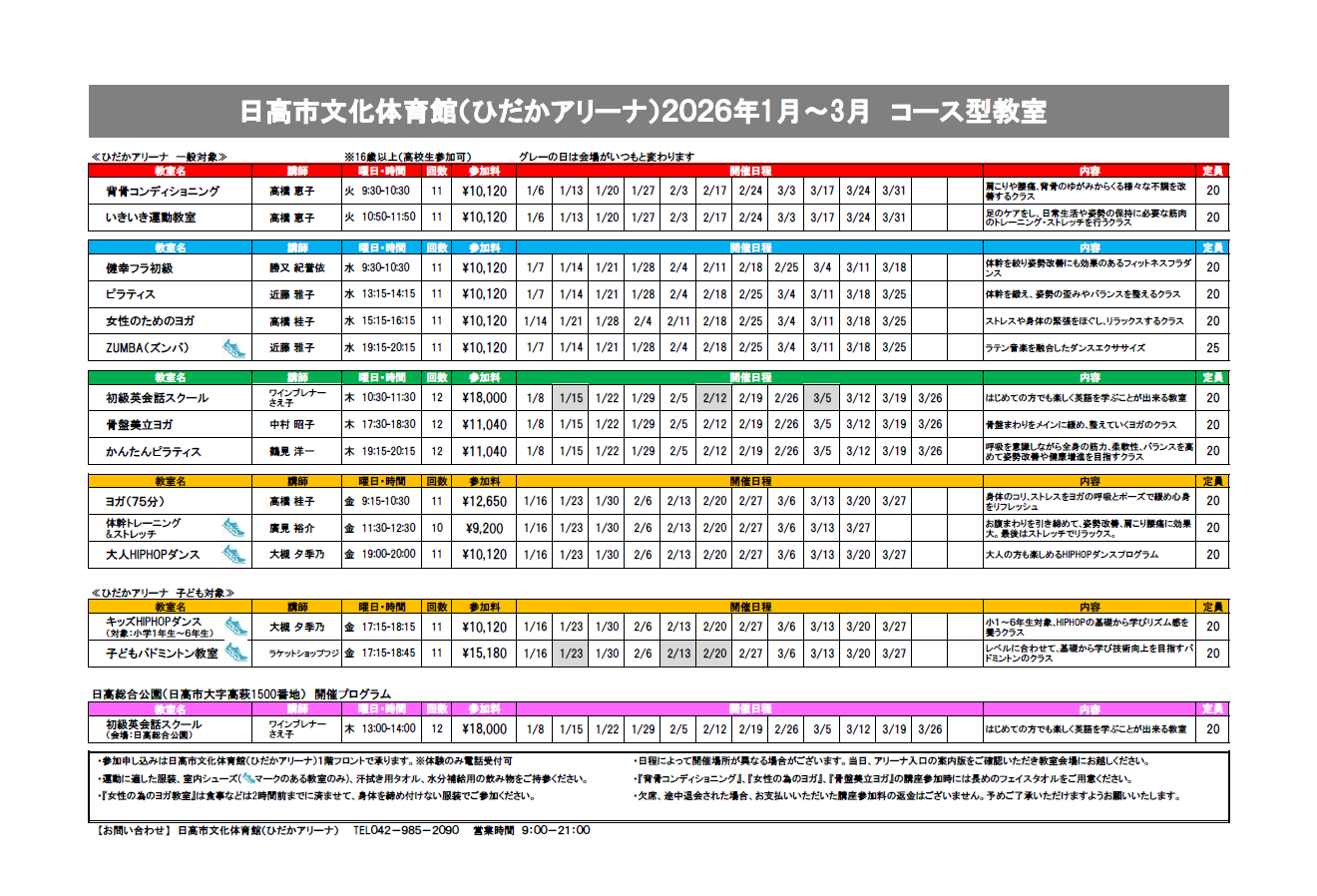 ・参加申し込みは日高市文化体育館(ひだかアリーナ)1階フロントで承ります。※体験のみ電話受付可